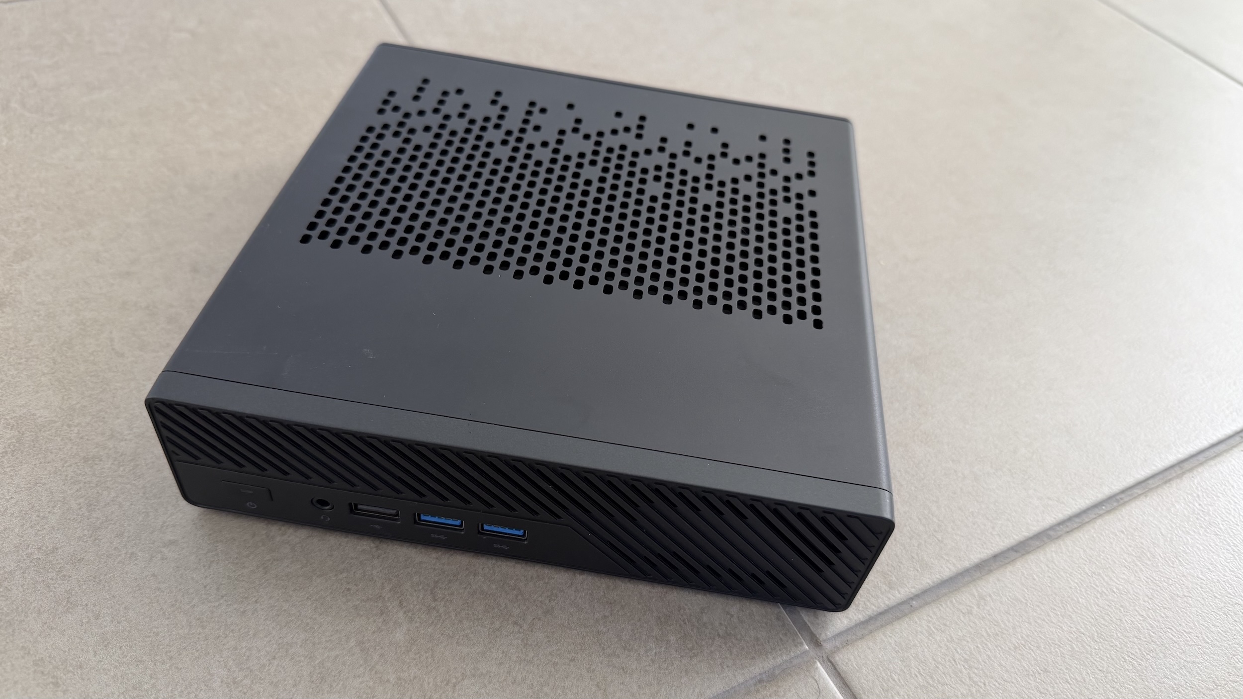 It features an attractive grill design on the front, top, and sides, which helps improve airflow within the MS-A1's compact chassis. It's black and made with solid aluminium around the chassis, making it a sturdy device that helps with cooling.