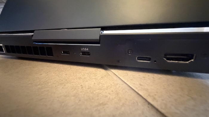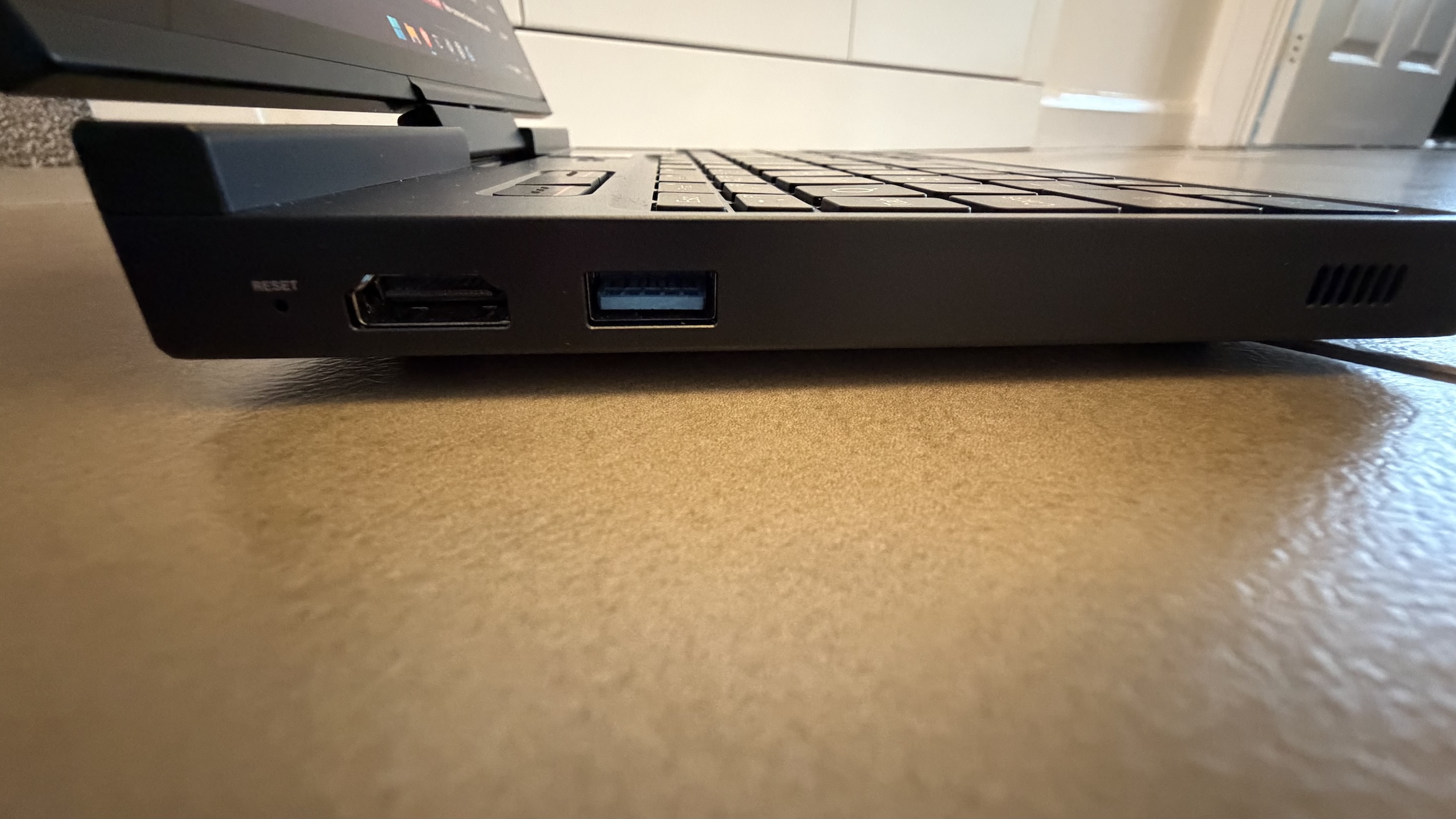 On the left side, you'll find a USB 3.0 Type-A port and an HDMI 2.1 port. The left-side ports are upside down, and it's an extraordinary design choice to put a USB port upside down like this (see the photo).