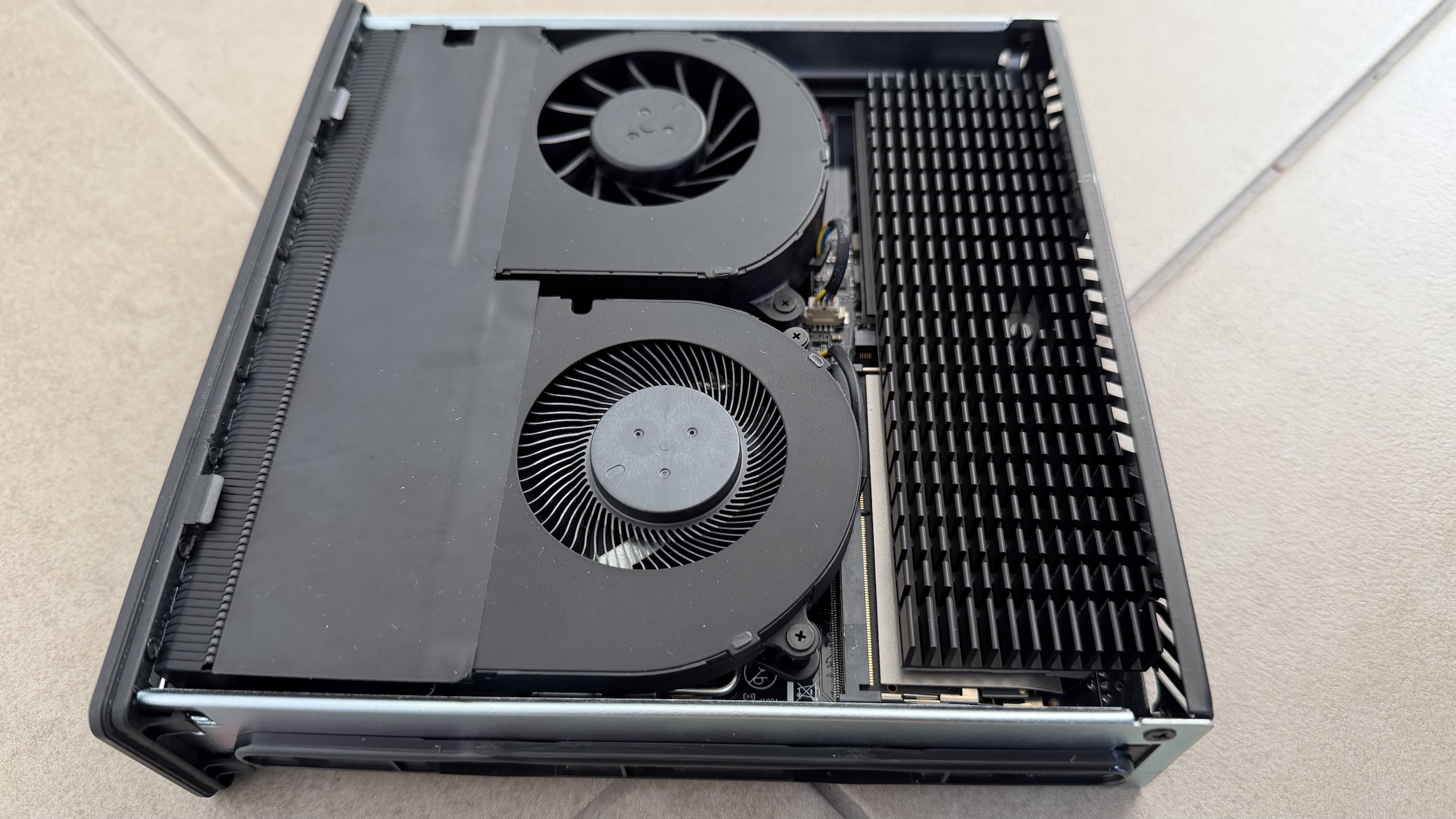 The magic happens inside, though. The CPU is a desktop CPU, so you can replace that. The memory modules are SODIMMs, so you can replace them with standard SODIMMs of the same size and type (DDR5). The storage slots are standard M.2 slots.