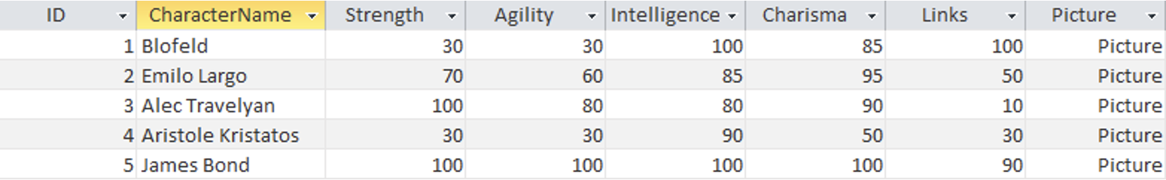Fields CharacterName, Strength, Agility, Intelligence, Picture