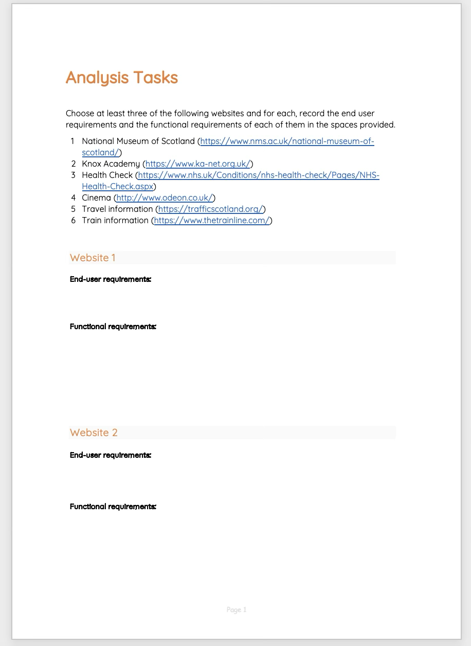 Work through the Analysis Tasks worksheet by identifying the end-user and functional requirements of up to three websites