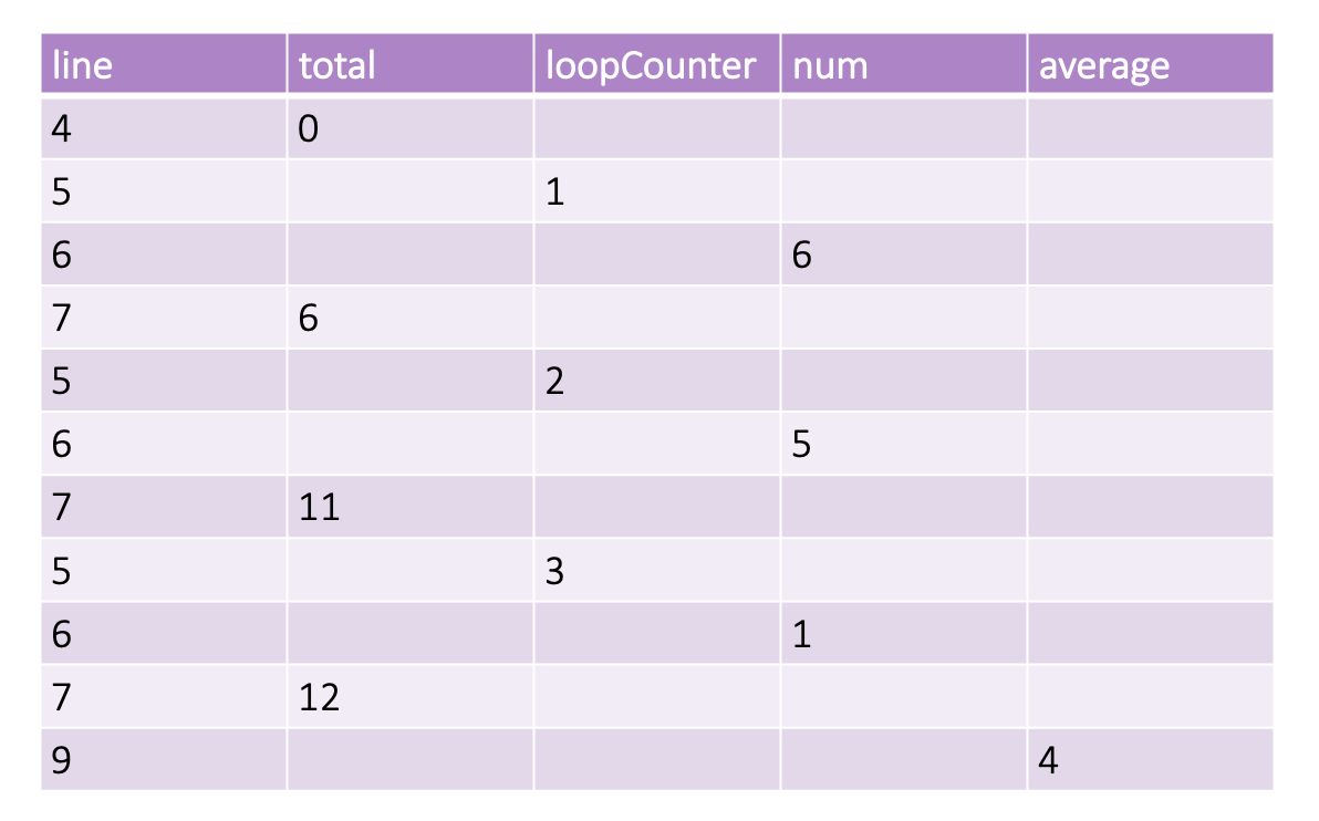 • Trace tables keep a record of what a variable is at each line when it changes.