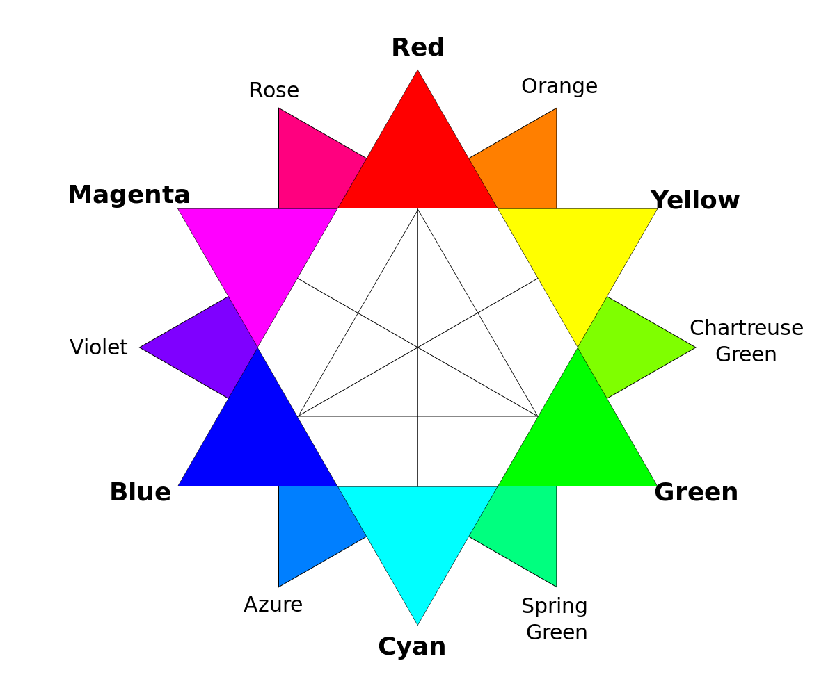 • The colour wheel was mentioned earlier as being composed of three primary colours, red, blue and yellow. These are known as the traditional primary colours since they relate to the way in which printed media and art are composed using pigments rather than the composition of light.
