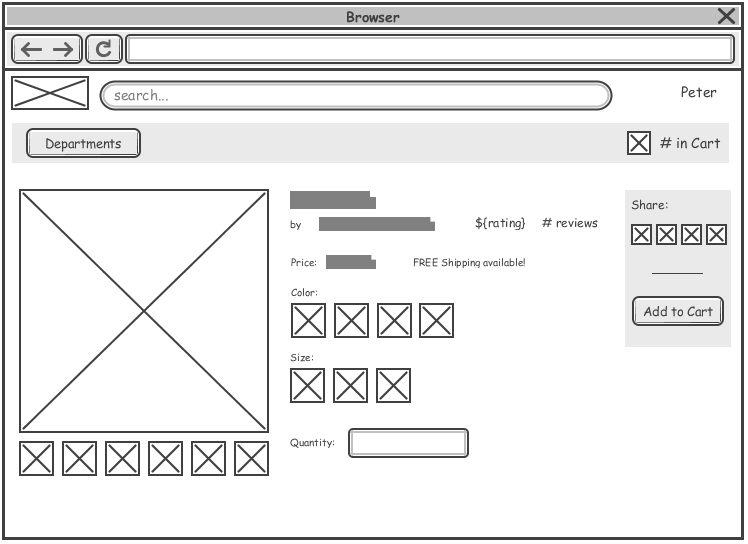 • Only headings or keywords (such as Add to Cart, the user's login name etc) are represented with text. Off squiggly lines just represent the text