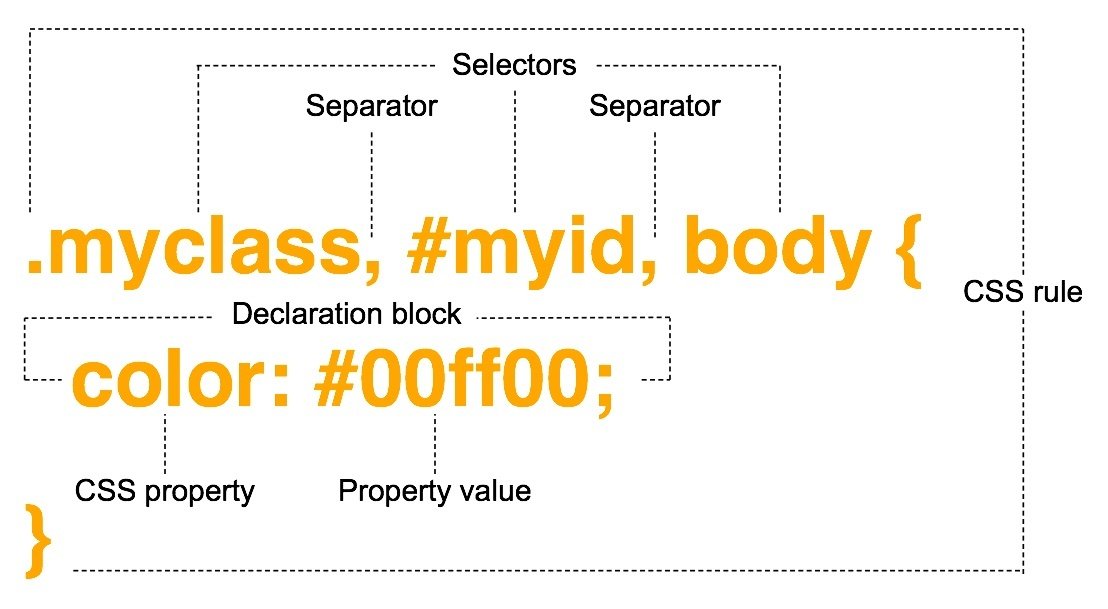 • CSS is composed of a selector (e.g. h1) and property and value pairs.