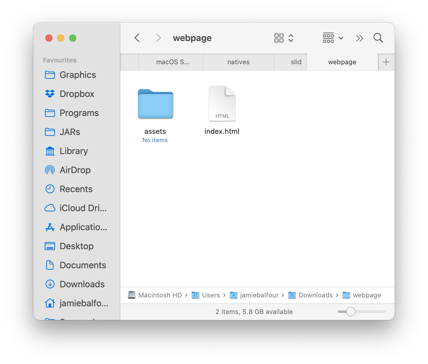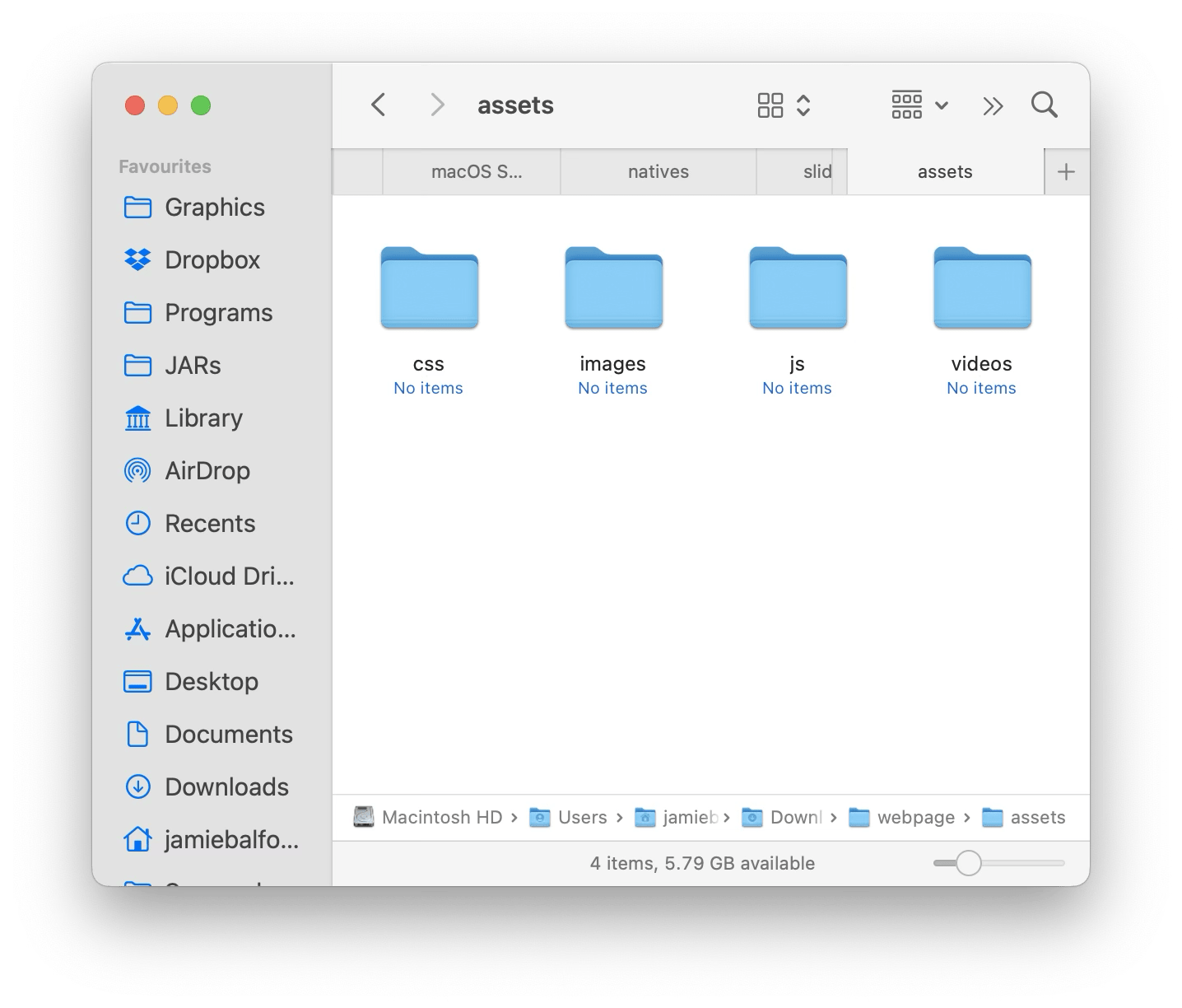 • An assets folder is a good idea for storing things like images, CSS and JavaScript, videos and reusable resources.