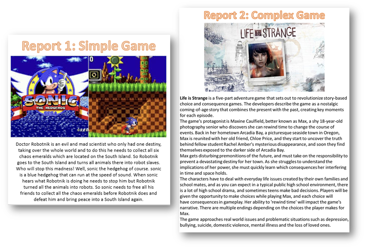 Create a narrative for three games, one simple game (e.g. Sonic) one complex game (e.g. Life Is Strange) and one for your own game idea.